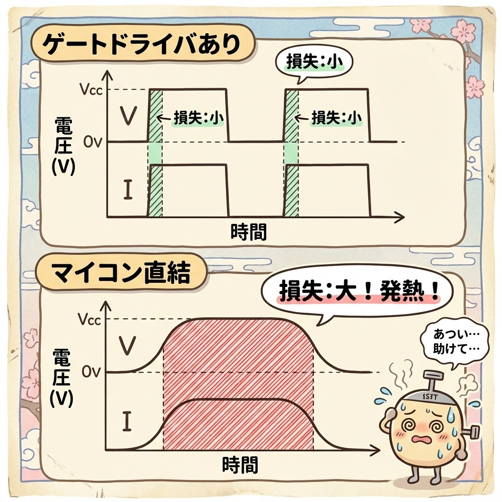 実は、それではまともに動かないのです。この記事では、なぜゲートドライバICが必要なのか、その「物理的な理由」をイメージ重視で完全図解します。