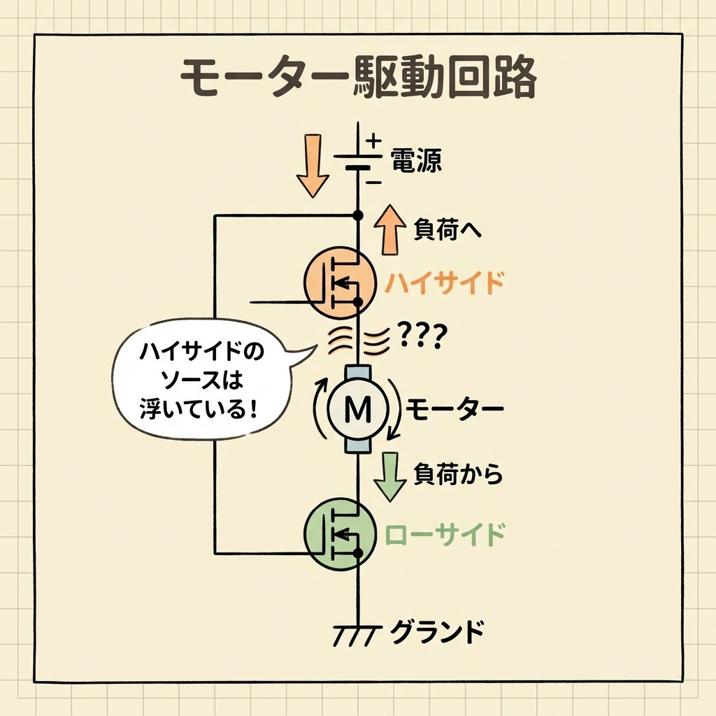 | ハイサイド駆動 | 浮いたソースを基準に駆動 | 理由③:ハイサイド |