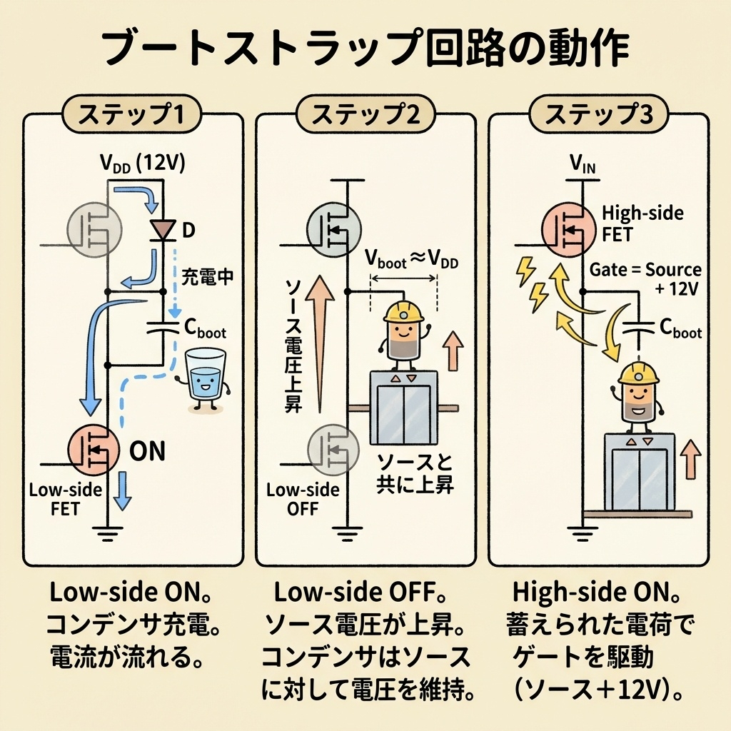 ハイサイドMOSFETを駆動するために、ゲートドライバICは「ブートストラップ回路」という巧みな仕組みを使います。