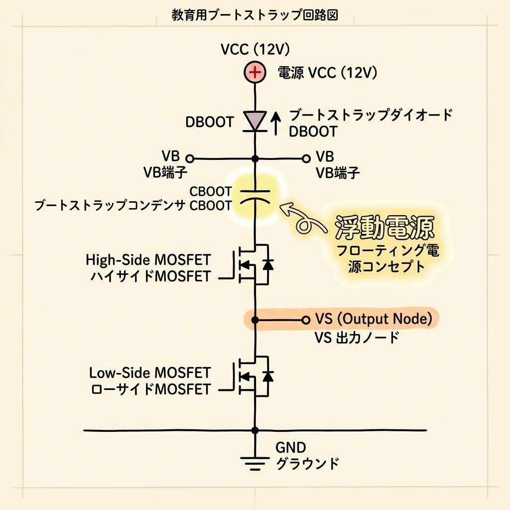 VB端子はブートストラップ電源の「+側」、VS端子は「−側(基準)」です。CBOOTはこの2点間に接続され、常にVB − VS ≈ 12Vを維持しようとします。