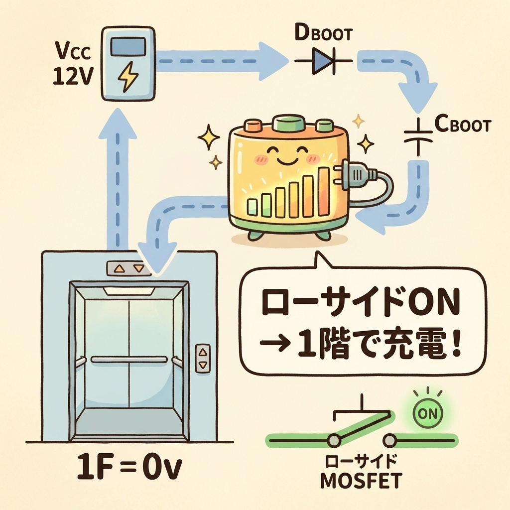電源投入直後、CBOOTは空っぽです。最初にローサイドをONして充電する「プリチャージシーケンス」が必要になります。