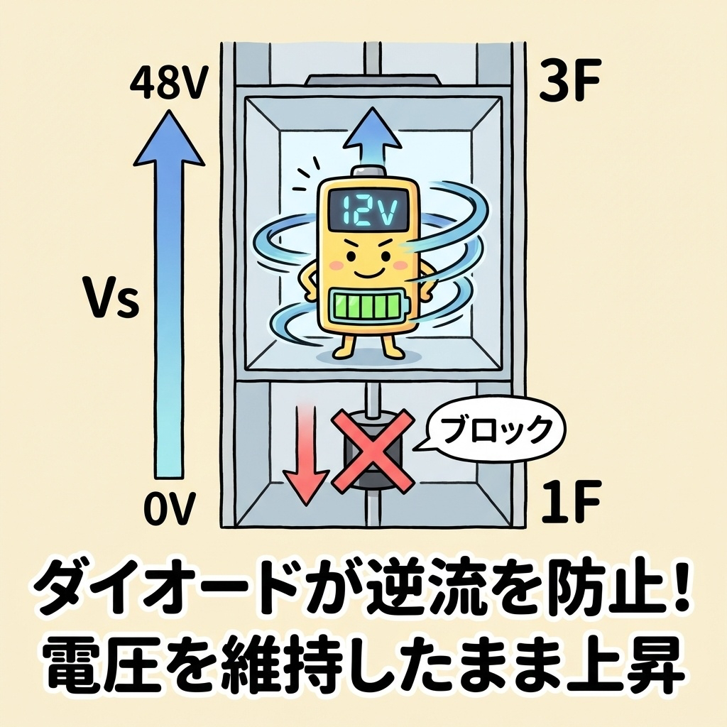 CBOOTはVS端子を「−側の基準」として12Vを蓄えています。だから、VS端子の電位が上昇しても、VB − VS = 12Vという関係は変わりません。バッテリーがエレベーターと一緒に上昇するのと同じです。