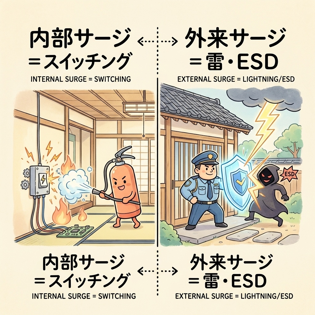 | 主な脅威 | スイッチングサージ(内部発生) | 外来サージ(雷・ESD・ノイズ) |