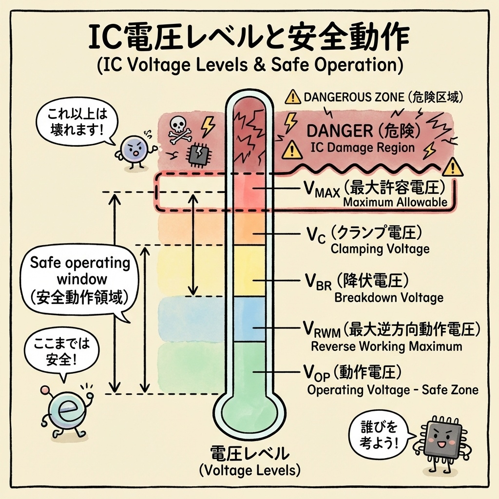 TVSダイオード選定の本質は、「VRWMとVCの間に適切な"窓"を設ける」ことです。