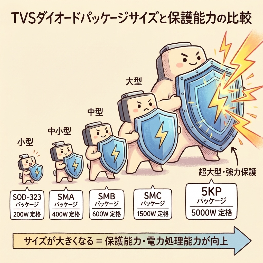 一般的なTVSダイオードは400W〜3000W程度。パッケージサイズが大きいほど高耐量です。
