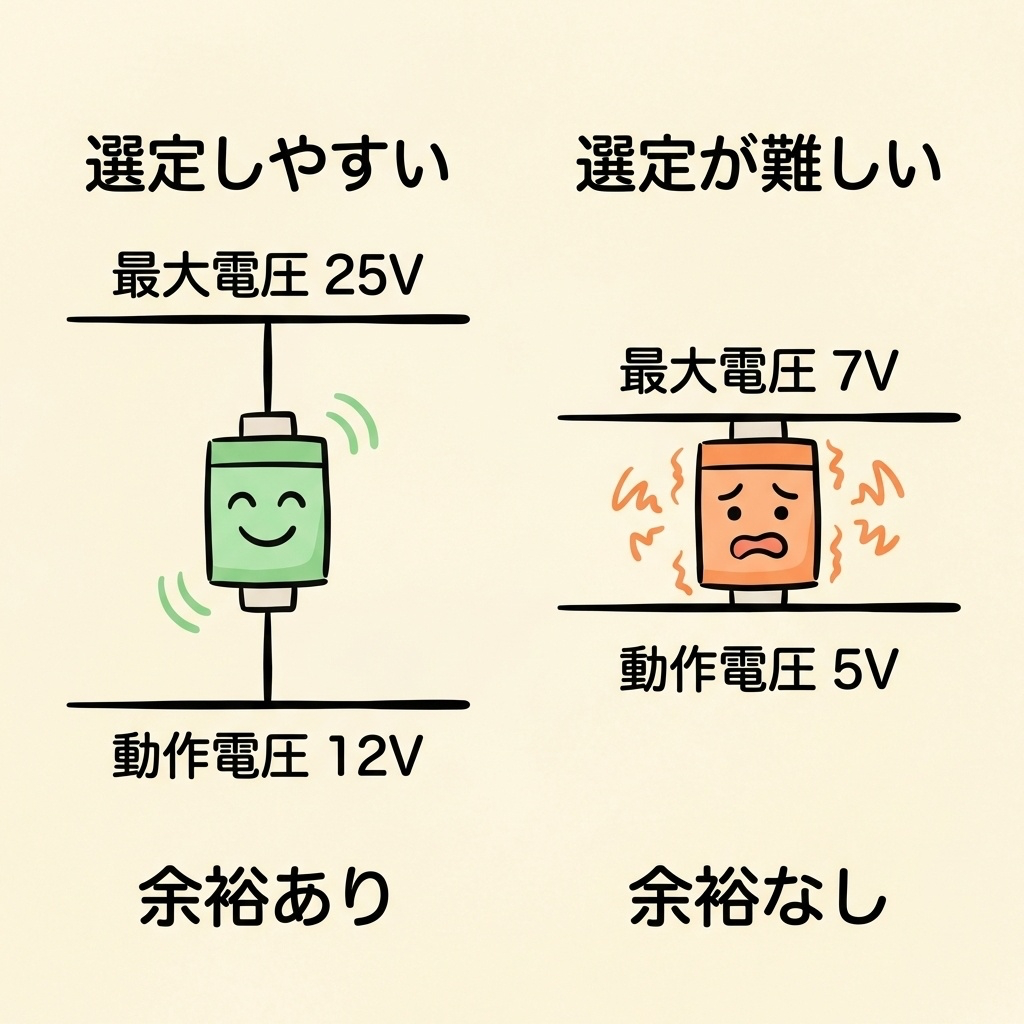 この「窓」が狭い回路(例:3.3V系)ほど、選定が難しくなります。