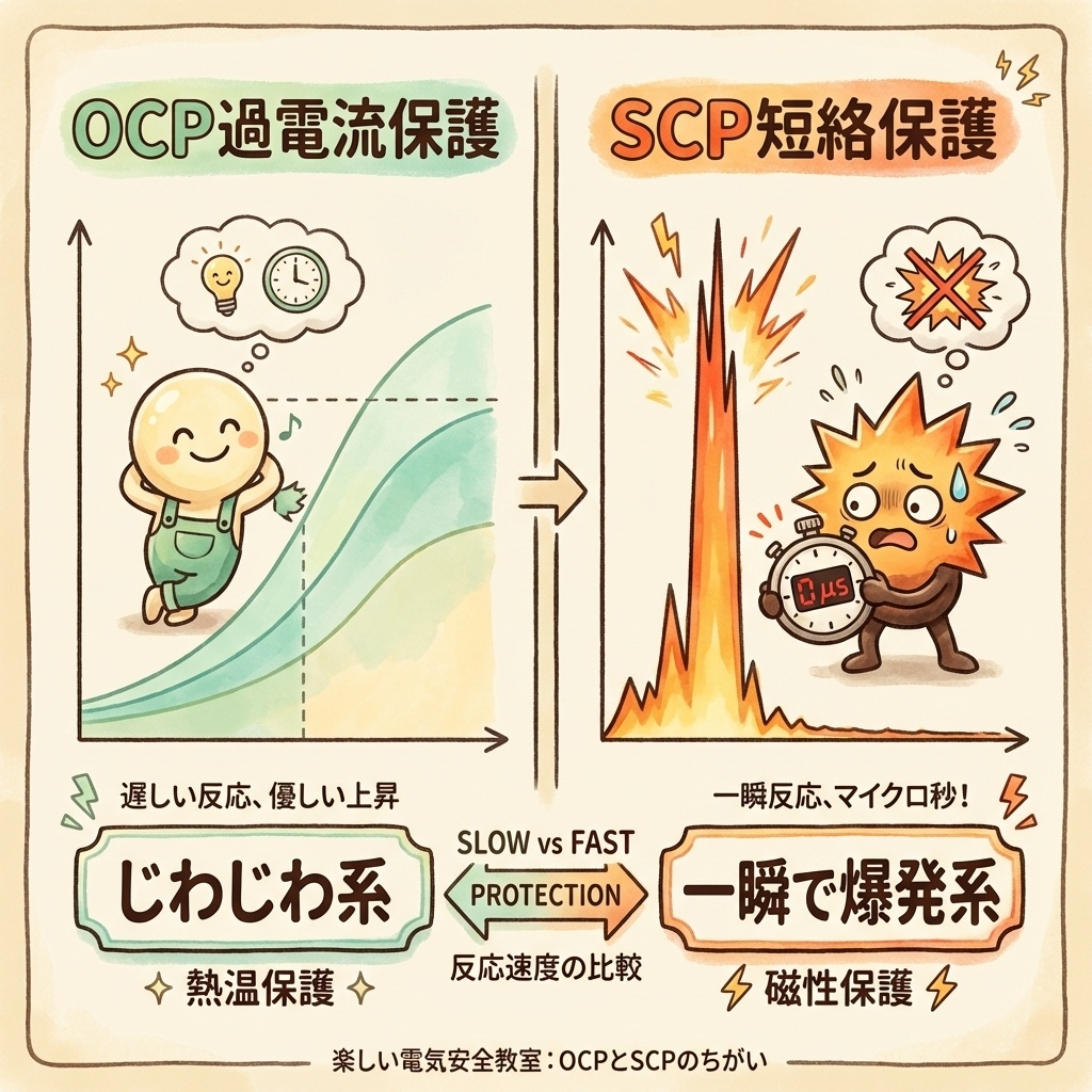 • 短絡保護(SCP)と過電流保護(OCP)は別物:OCPは「じわじわ系」、SCPは「一瞬で爆発系」に対応