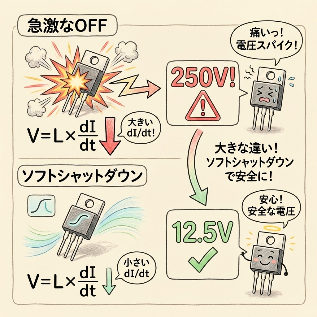 • ソフトシャットダウン必須:急激なOFFはL×dI/dtのサージで素子を壊す