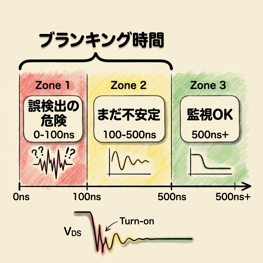 ブランキング時間は「短すぎると誤検出」「長すぎると保護が遅れる」のトレードオフです。最初は2μs程度で設計し、実機で波形を見ながら調整するのが現実的です。