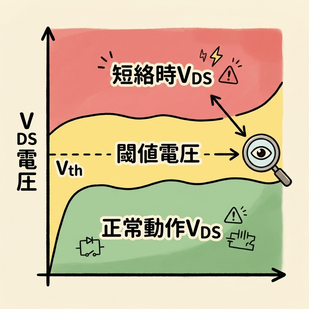 正常動作時、MOSFETは「飽和領域」で動作し、ドレイン-ソース間電圧(VDS)は非常に小さい(数百mV〜数V程度)。しかし短絡が発生すると、電流が爆発的に増加し、MOSFETは「非飽和領域」に追い出され、VDSが急上昇します。