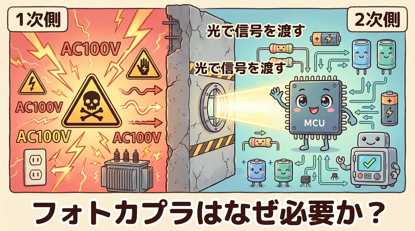 - なぜフォトカプラが必要か? → 1次側(高電圧・危険)と2次側(低電圧・安全)を電気的に絶縁しながら、信号だけを渡すため