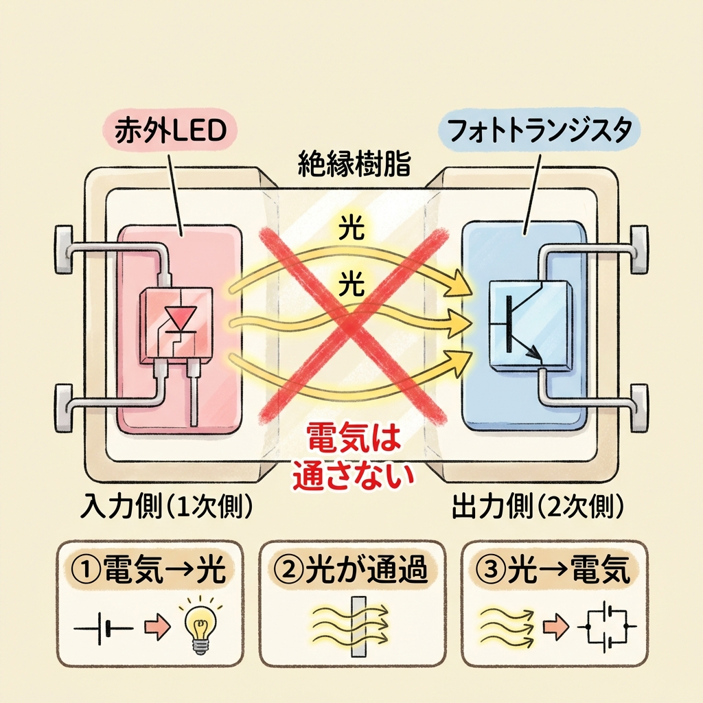 エネルギーの変換経路は「電気→光→電気」の2段変換です。光が橋渡し役(メディエーター)になることで、1次側と2次側の間に電気的な接続を一切作らずに、信号だけを渡すことができます。これが「光なら電気は流れない」という原理の正体です。
