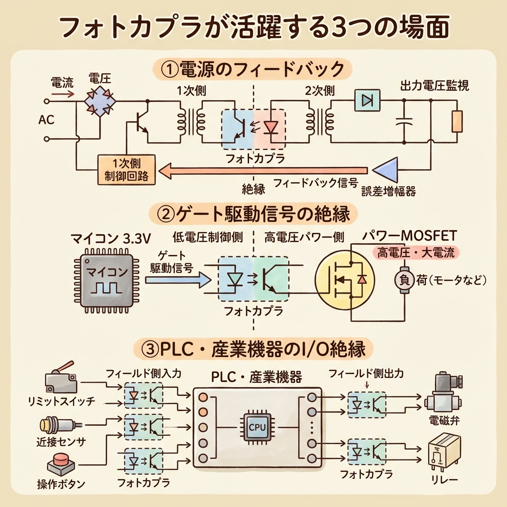 原理がわかったところで、実際にどんな場面でフォトカプラが登場するのかを見ていきましょう。パワエレ設計では、以下の3つが代表的な使用場面です。
