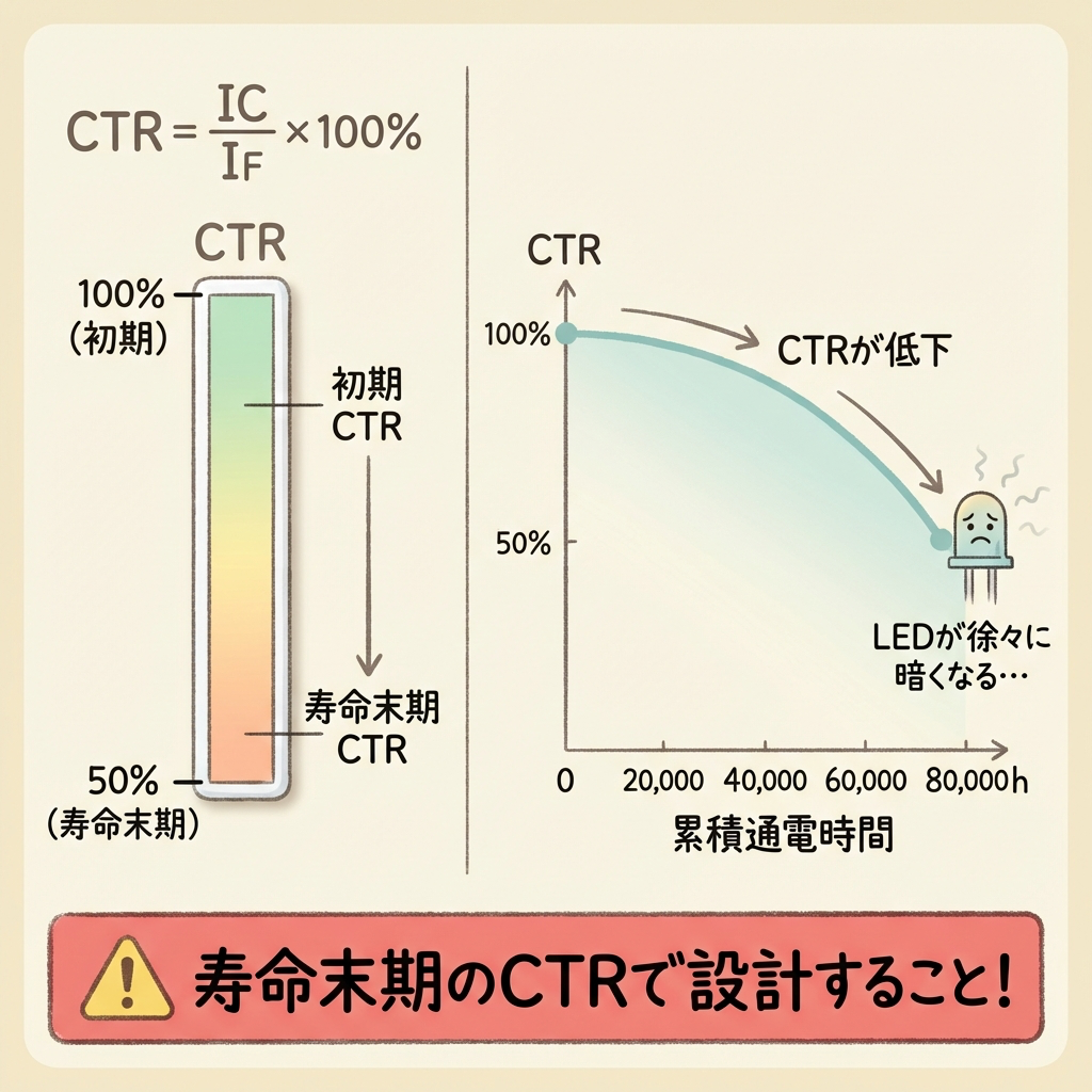 フォトカプラは「枯れた技術」とはいえ、設計で無視できない弱点があります。その最大のポイントがCTR(Current Transfer Ratio:電流伝達率)と、LEDの経年劣化です。