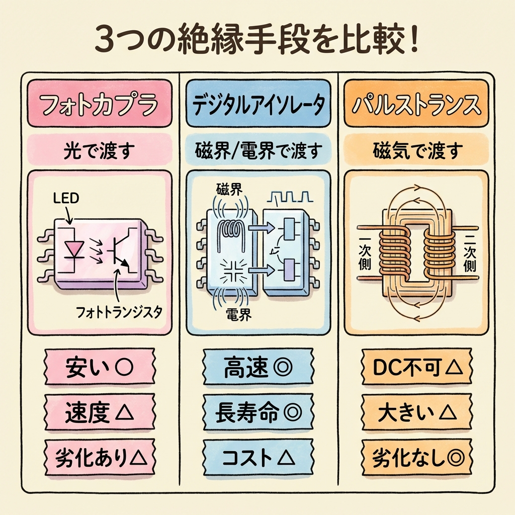 - 代替手段は? → デジタルアイソレータ(高速・長寿命)とパルストランス(電源不要・DCは不可)。用途に応じて使い分ける