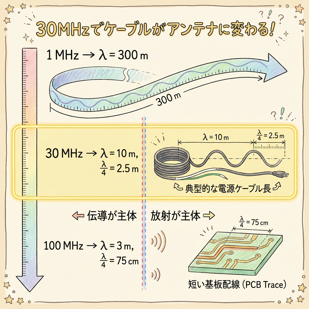アンテナが効率よく電磁波を放射するには、おおむねλ/4以上の長さが必要です。30 MHzでのλ/4は約2.5 m。1 m程度のケーブルでは放射効率が低く、ノイズは「線の中を伝わる」形態のままです。