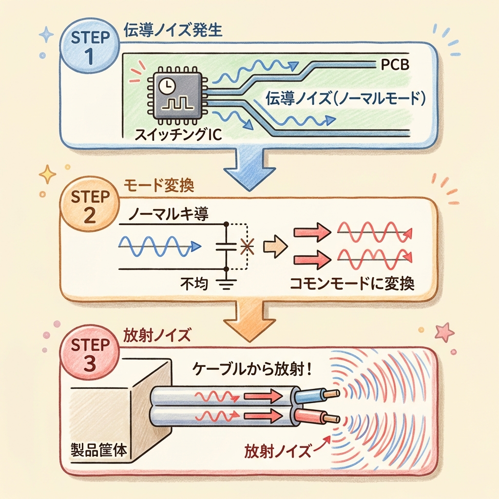 ここで実務的に非常に重要なポイントがあります。伝導ノイズと放射ノイズは完全に独立した現象ではなく、互いに変換されるのです。