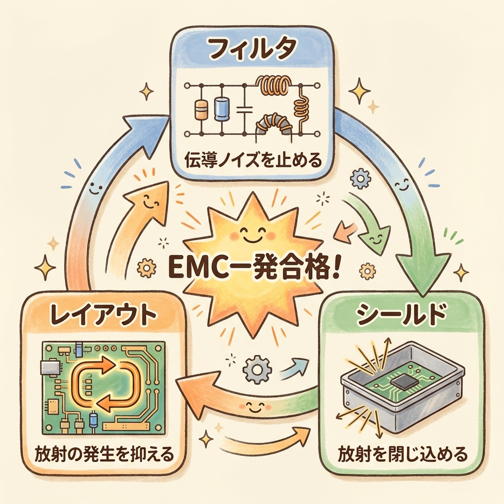 - 設計段階で「フィルタ+レイアウト+シールド」を三位一体で考えることが、一発合格への近道。