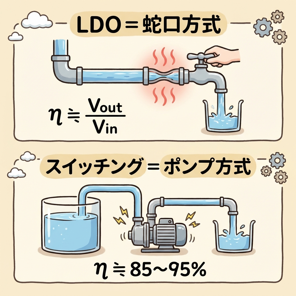 • LDOは「蛇口を絞る」方式。エネルギーを捨てる(=熱になる)ため効率は入出力比で決まる