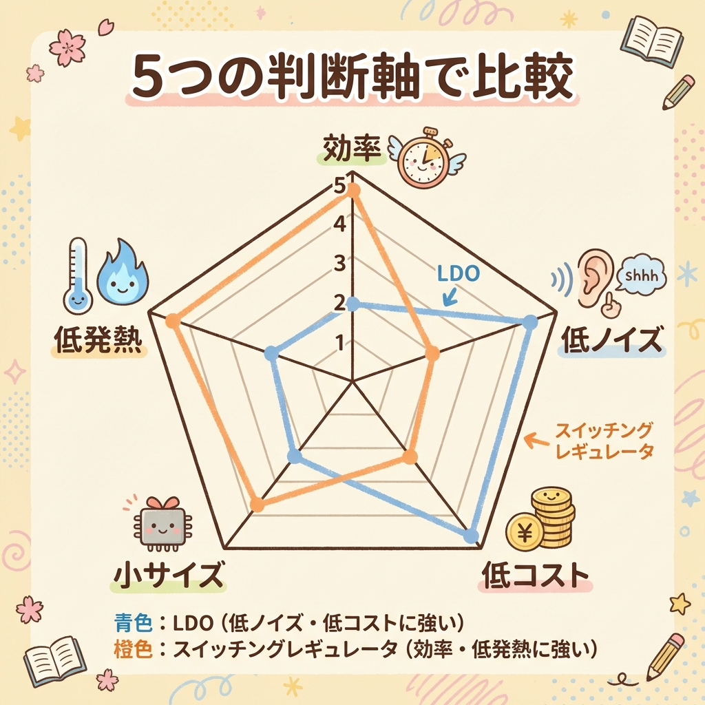 【完全図解】なぜLDOとスイッチングレギュレータを使い分けるのか?|効率・ノイズ・コストの判断基準を初心者向けに徹底解説