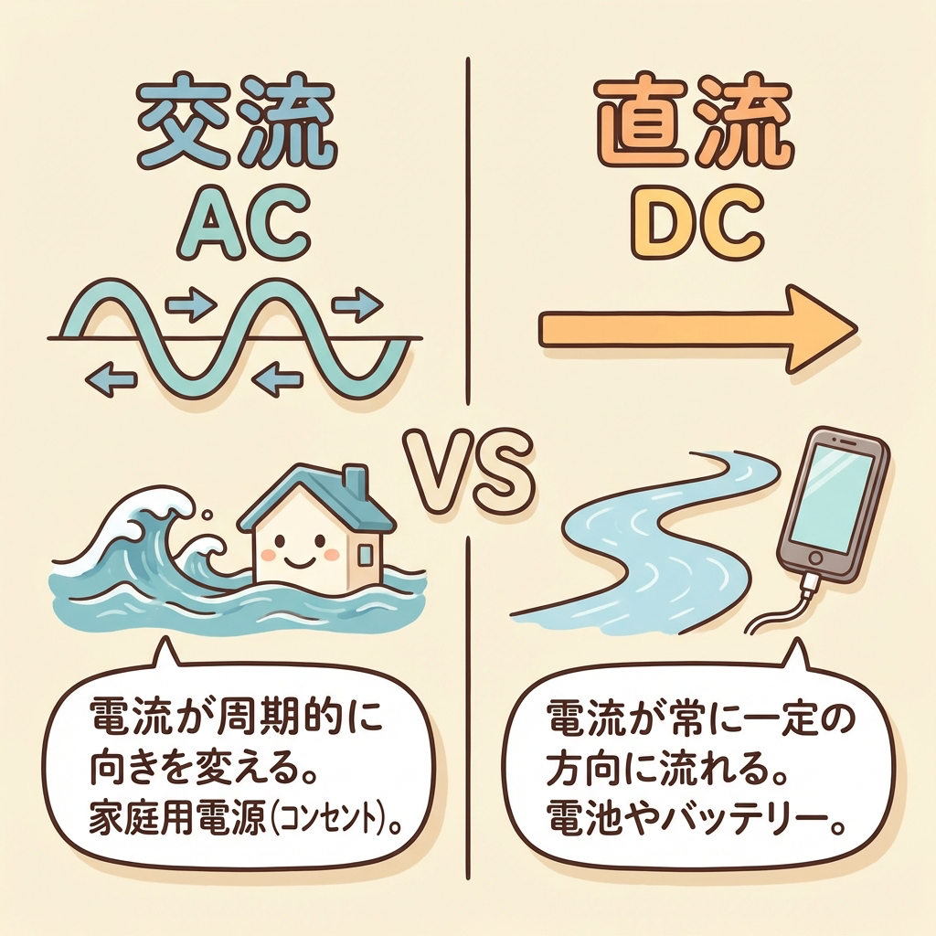交流は、電流の方向が常に行ったり来たりする電気です。海の潮が「満ちて、引いて」を繰り返すのと同じイメージですね。家庭のコンセントの100Vは、1秒間に50回(東日本)または60回(西日本)もプラスとマイナスが入れ替わっています。