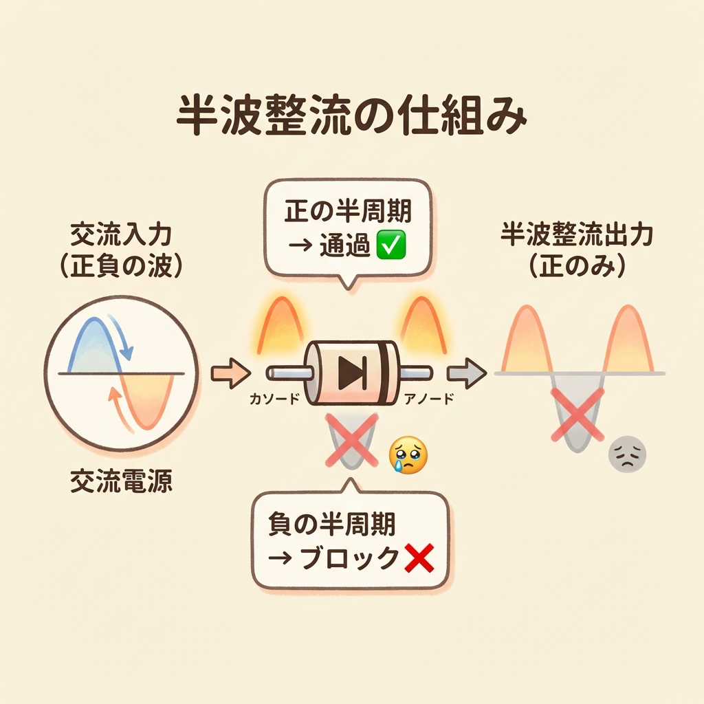 🔧 半波整流の仕組み|「右からの水だけ通す」