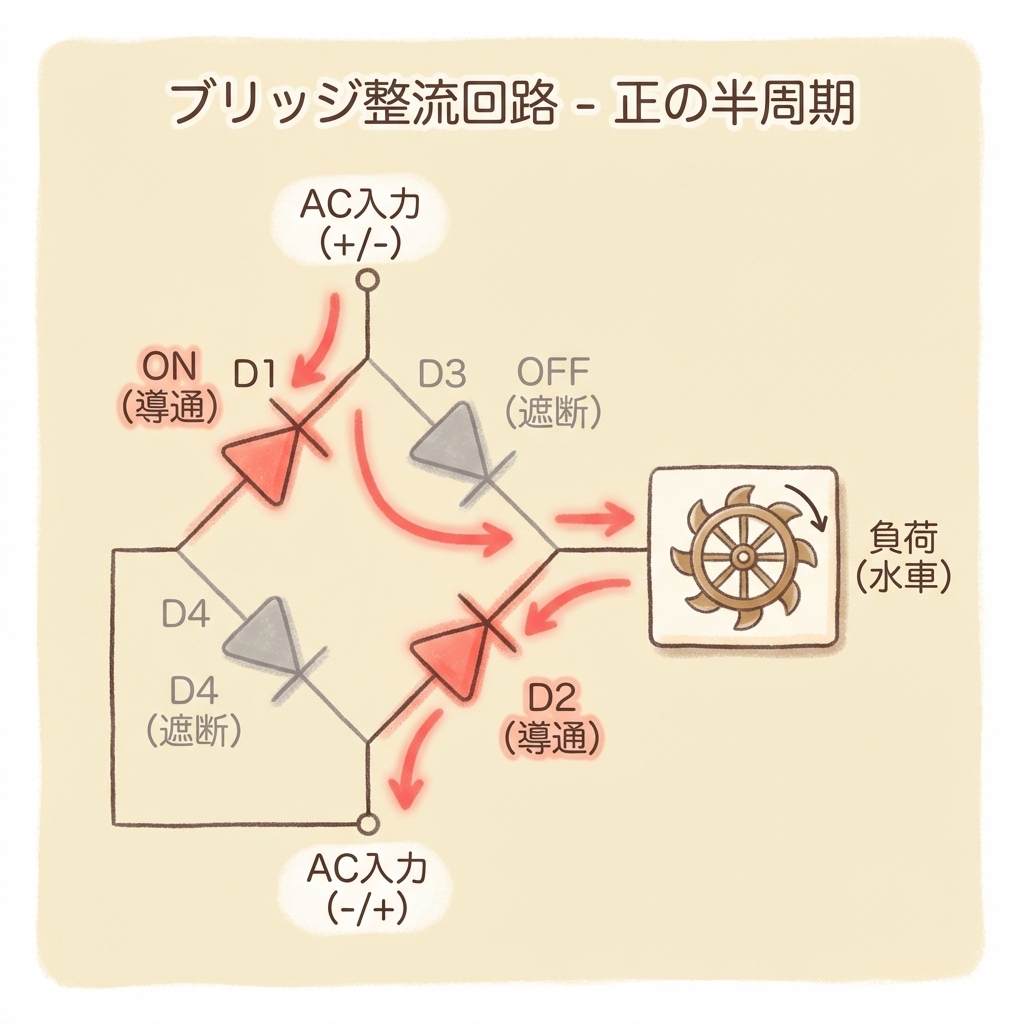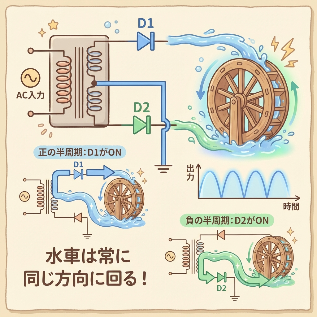 そこで、ダイオード(一方通行の弁)を使って「どちらから水が来ても、水車には必ず同じ方向から当たるようにする」仕組みを作ります。これが整流回路の本質です。