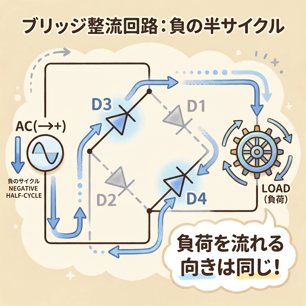 🔵 負の半周期 D3, D4 D1, D2 負荷を上→下に通過 ⬇️(同じ!)