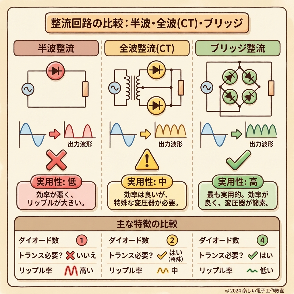 ここまで学んだ3つの整流方式を、一覧表で比較してみましょう。