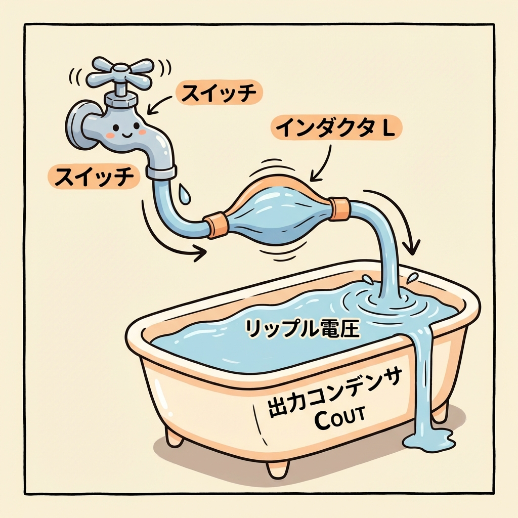 ON/OFFを繰り返すたびにインダクタ電流は三角波状にギザギザします。出力コンデンサ COUT はこのギザギザ(リップル電流)を吸収し、出力電圧をなめらかに保ちます。浴槽が大きいほど、水面(電圧)の揺れは小さくなります。
