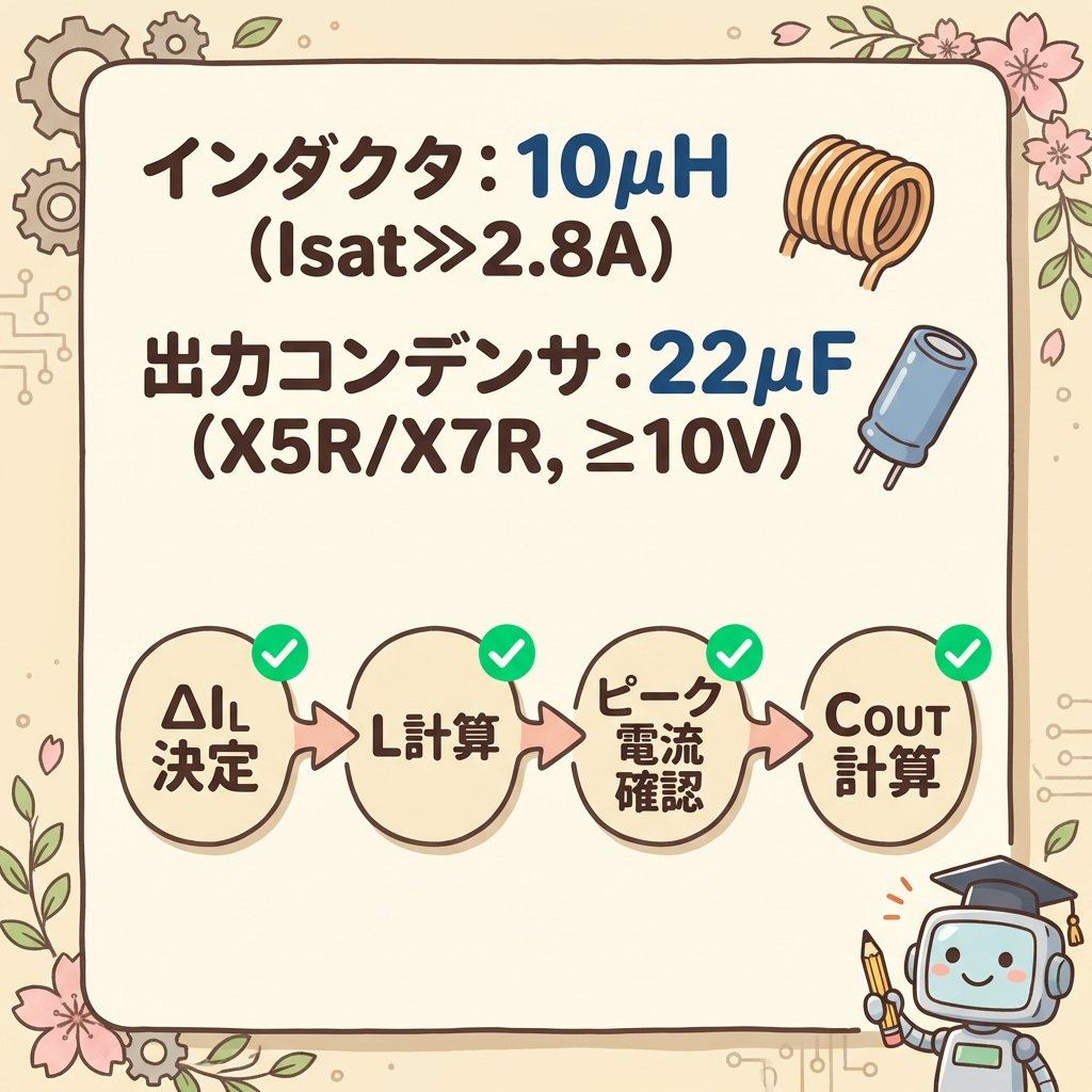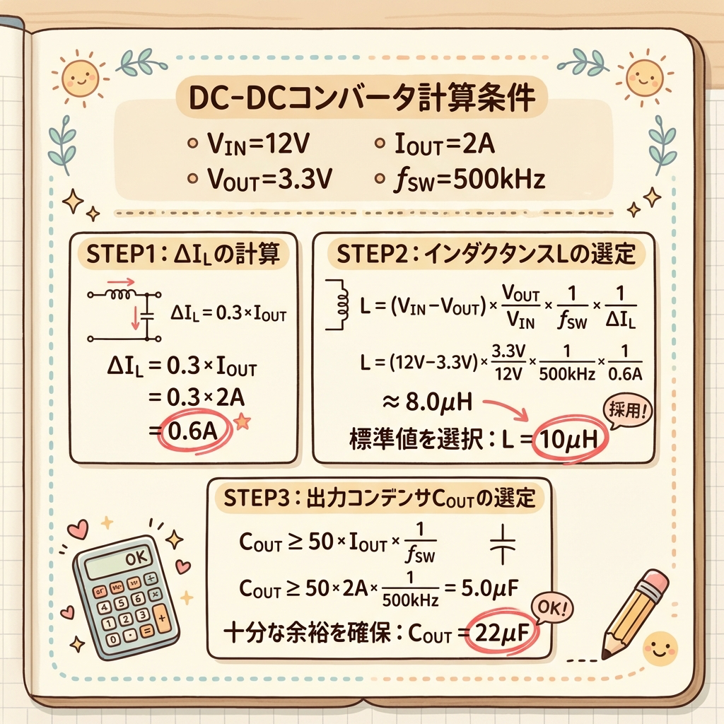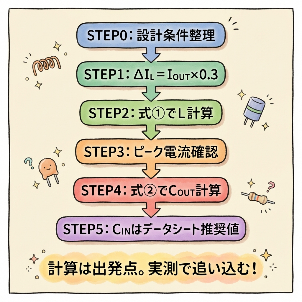 式② で出力コンデンサ COUT を計算 ── COUT = ΔIL / (8 × fSW × ΔVOUT)。DCバイアス特性を考慮し2〜3倍の容量を選ぶ