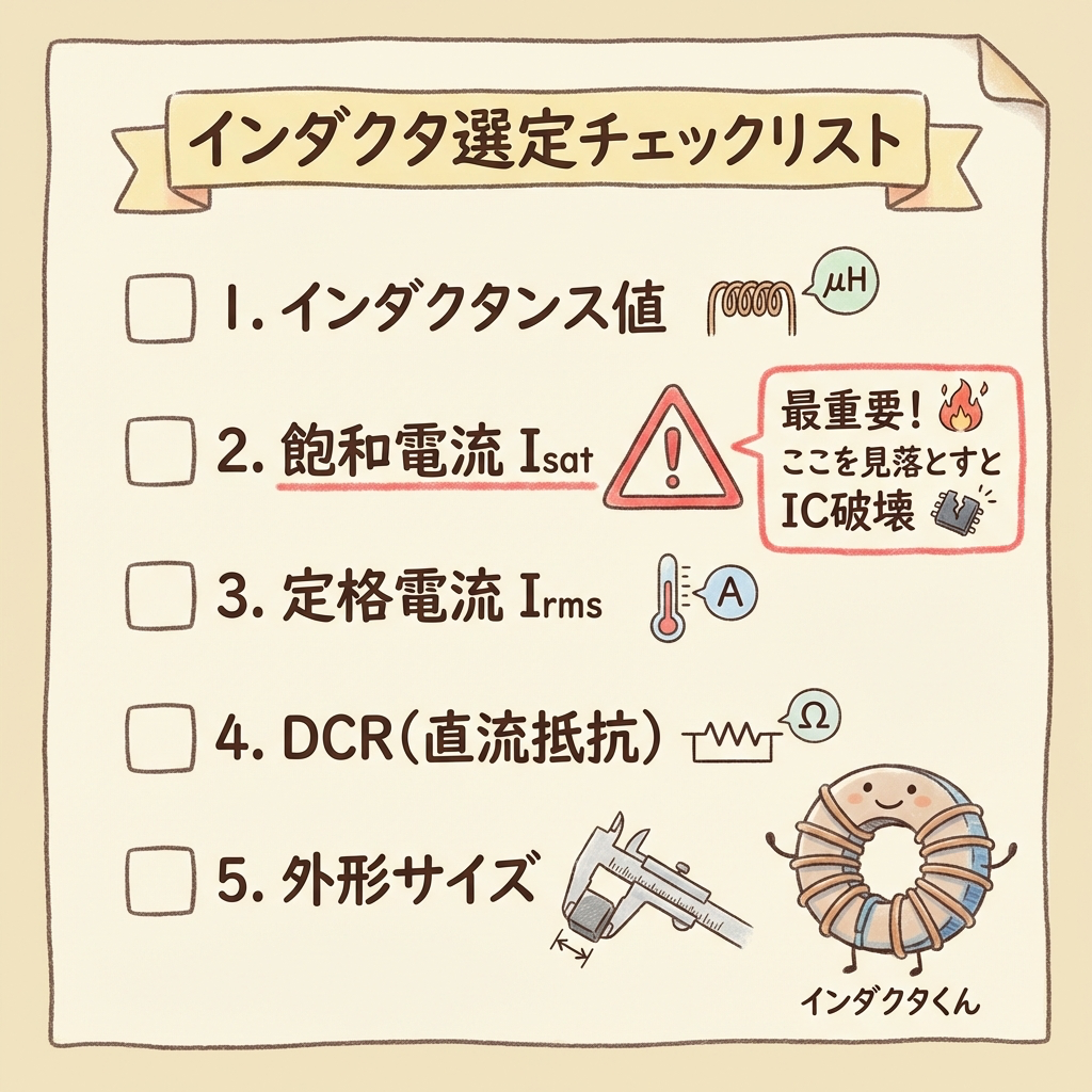 式①でインダクタンスの「値」は決まりましたが、実際の部品選定ではそれ以外にも確認すべき項目があります。以下のチェックリストを使ってください。