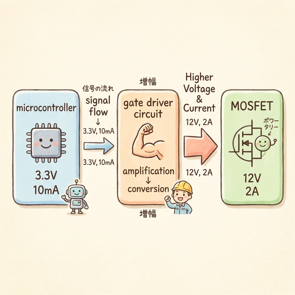 マイコンの出力とMOSFETの要求を比べると、電圧で3〜5倍、電流に至っては100倍以上のギャップがあります。このギャップを埋めるのが、ゲート駆動回路の仕事です。