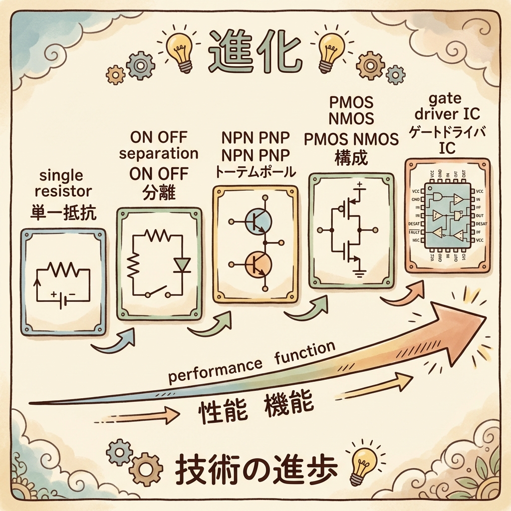 ④ 回路構成は5段階:抵抗1本 → ON/OFF個別抵抗 → NPN/PNPトーテムポール → PMOS/NMOSトーテムポール → ゲートドライバIC