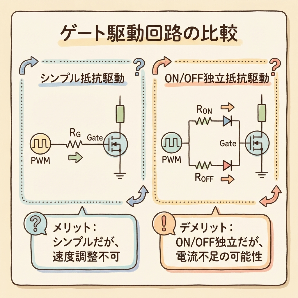 これにより、ON時はRON経由でゆっくり充電(ノイズを抑制)、OFF時はROFF経由で素早く放電(スイッチング損失を低減)といった独立調整が可能になります。実務では「OFFを速くしたい」場合が多いため、ROFF < RON とする設計が一般的です。