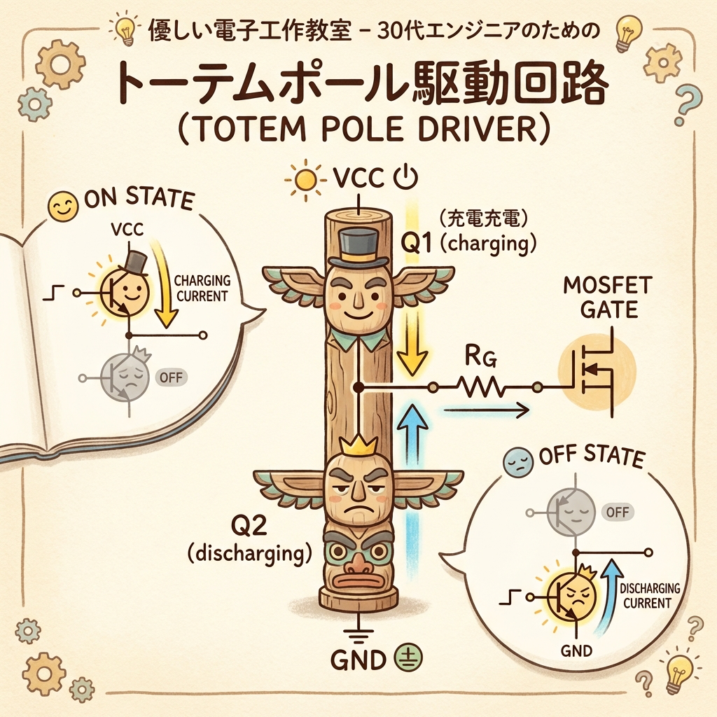ゲート駆動回路の世界で最も重要な回路構成が「トーテムポール(Totem-Pole)」です。名前の由来は、NPNトランジスタとPNPトランジスタを縦に積み上げた形がトーテムポール(柱状の彫刻)に似ていることから来ています。