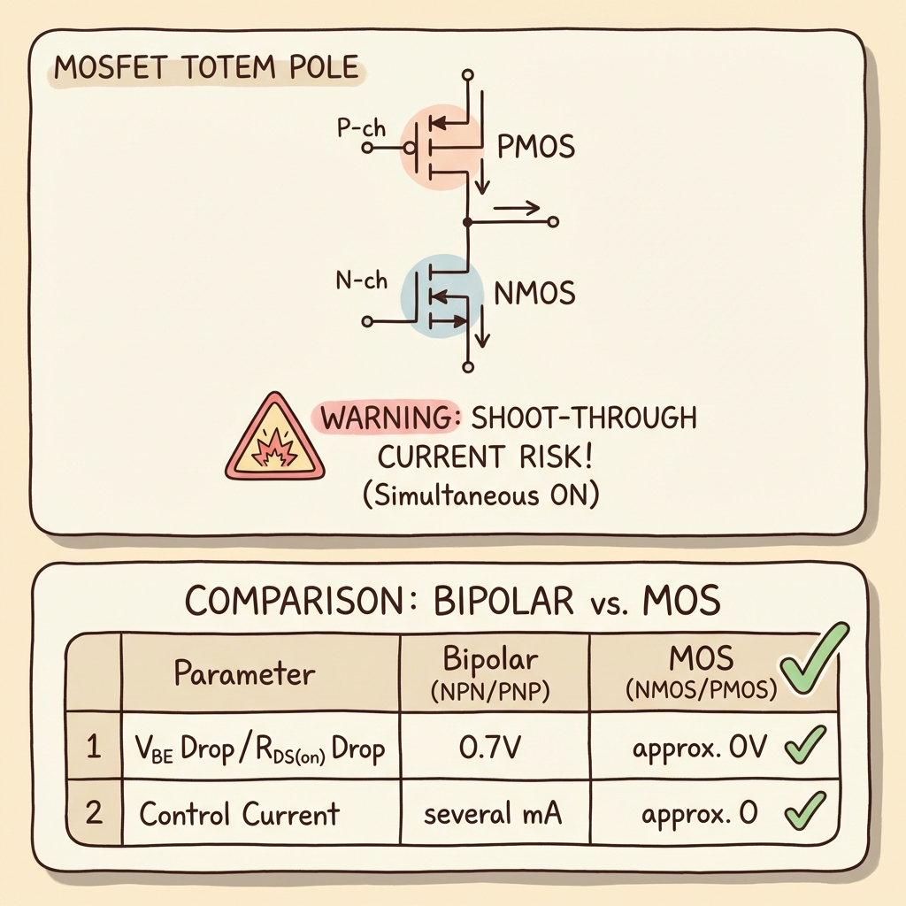 NPN/PNPトーテムポールの弱点であった「VBE降下による電圧ロス」を解決するために、バイポーラトランジスタの代わりにPMOS(上側)とNMOS(下側)のMOSFETペアを使う構成があります。