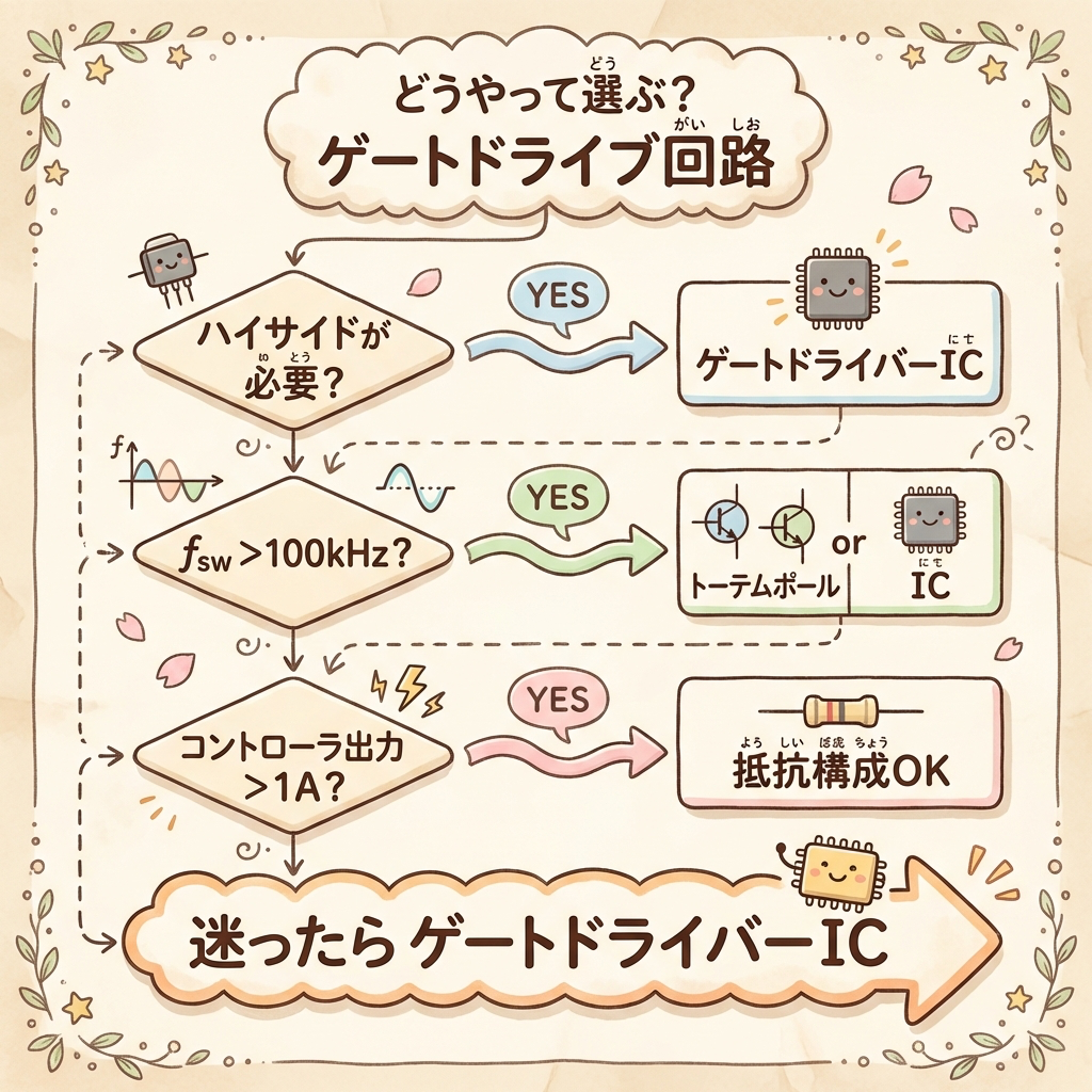 → YESの場合:❺ ゲートドライバIC(ハーフブリッジ型 or 絶縁型)一択です。ディスクリートでハイサイドを組むのは上級者でも困難です。