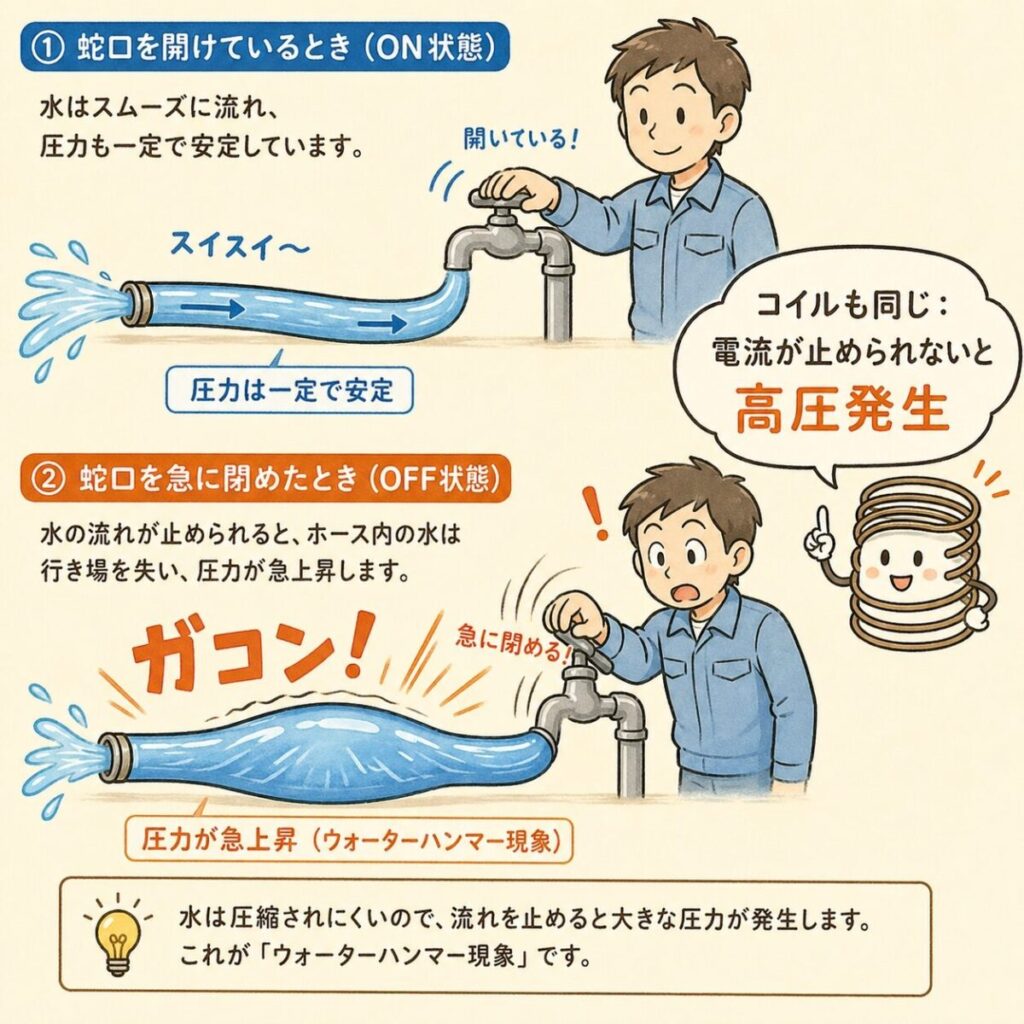 長いホースで水を勢いよく流していて、急に蛇口を閉めると「ガコン!」と衝撃(ウォーターハンマー)が起きますよね。あれは水の流れが急に止まらないから、ホース内に高い圧力が生じるのと同じ現象。コイルも電流(=水の流れ)を止められると、無理やり流し続けようとして高電圧(=高圧力)を発生させるのです。