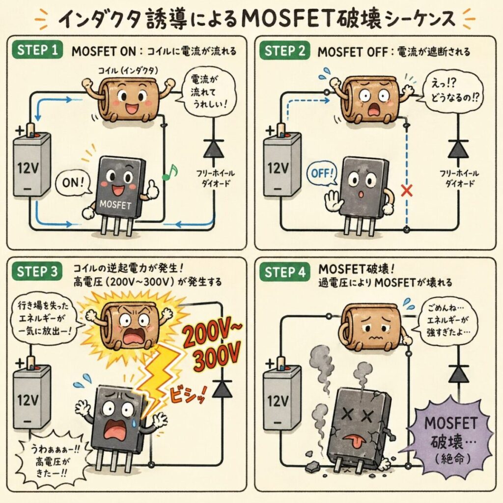 ここが本記事の核心です。リレーやモータをMOSFETでON/OFFする回路で、OFFにした瞬間に何が起きるかを時系列で見ていきましょう。