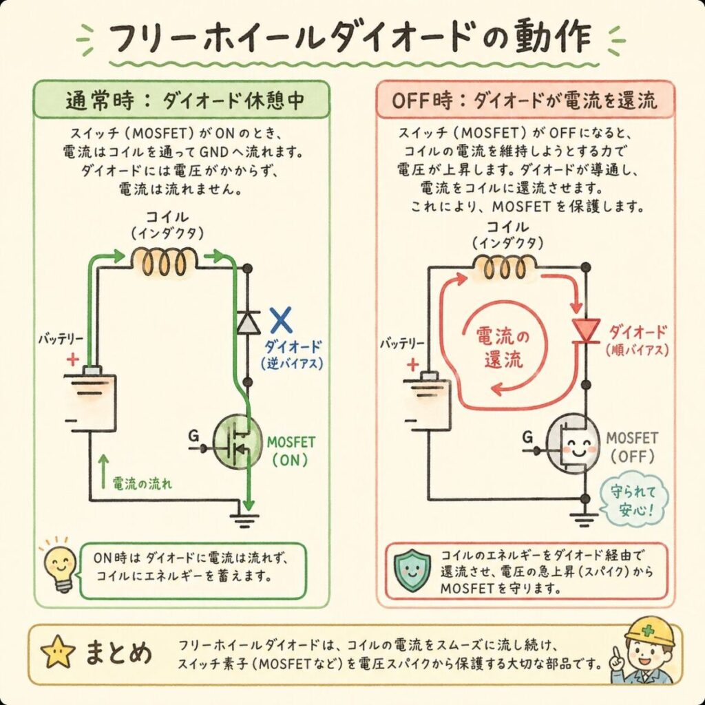 - OFF時、電流はコイル→ダイオード→コイルでループを作り、安全にエネルギーを消費
