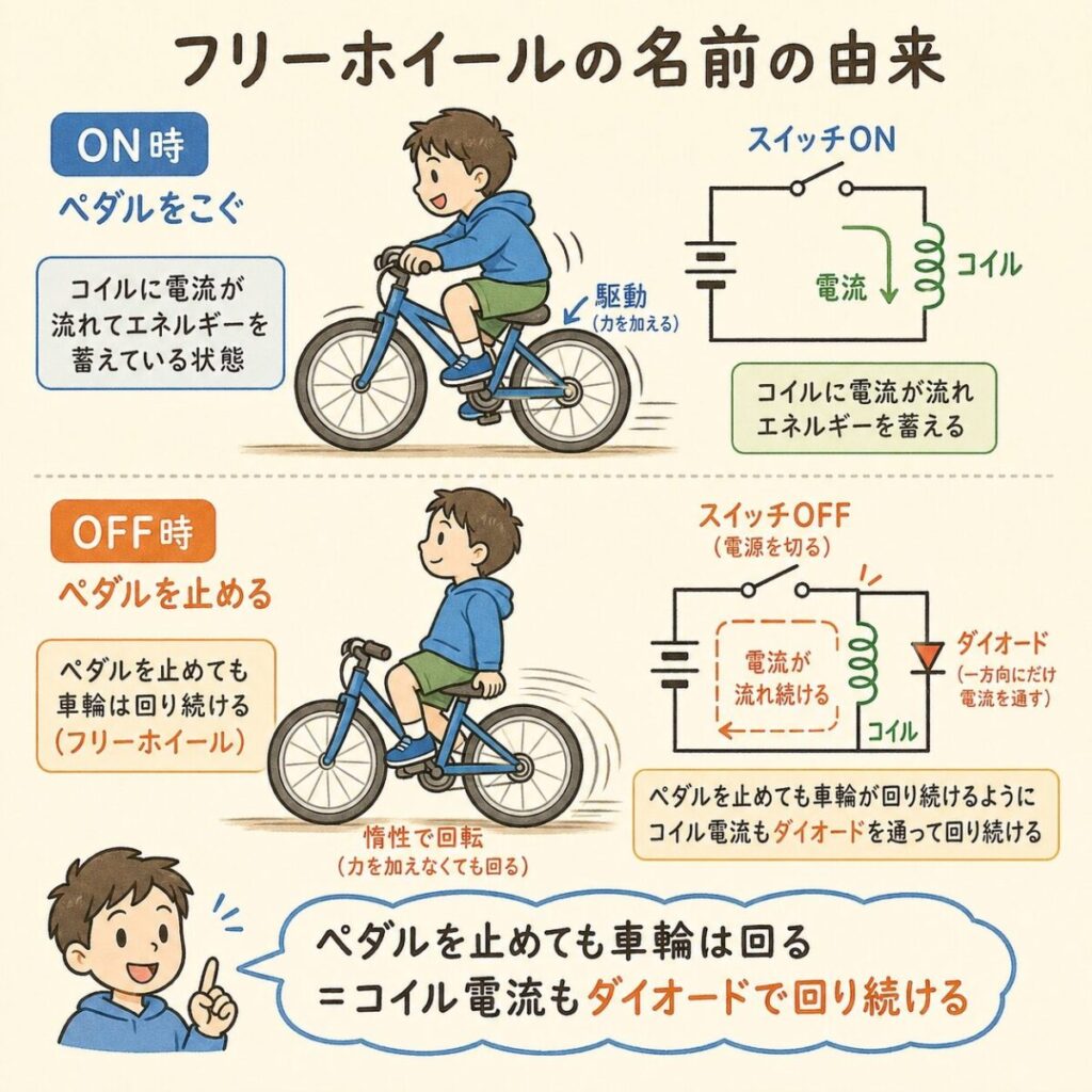 「フリーホイール(Free-wheel)」とは、自転車のフリーホイール(ペダルを止めても車輪が回り続ける機構)のこと。コイルの電流が、ダイオードのおかげで止まらずに「自由に回り続ける」イメージから来ています。