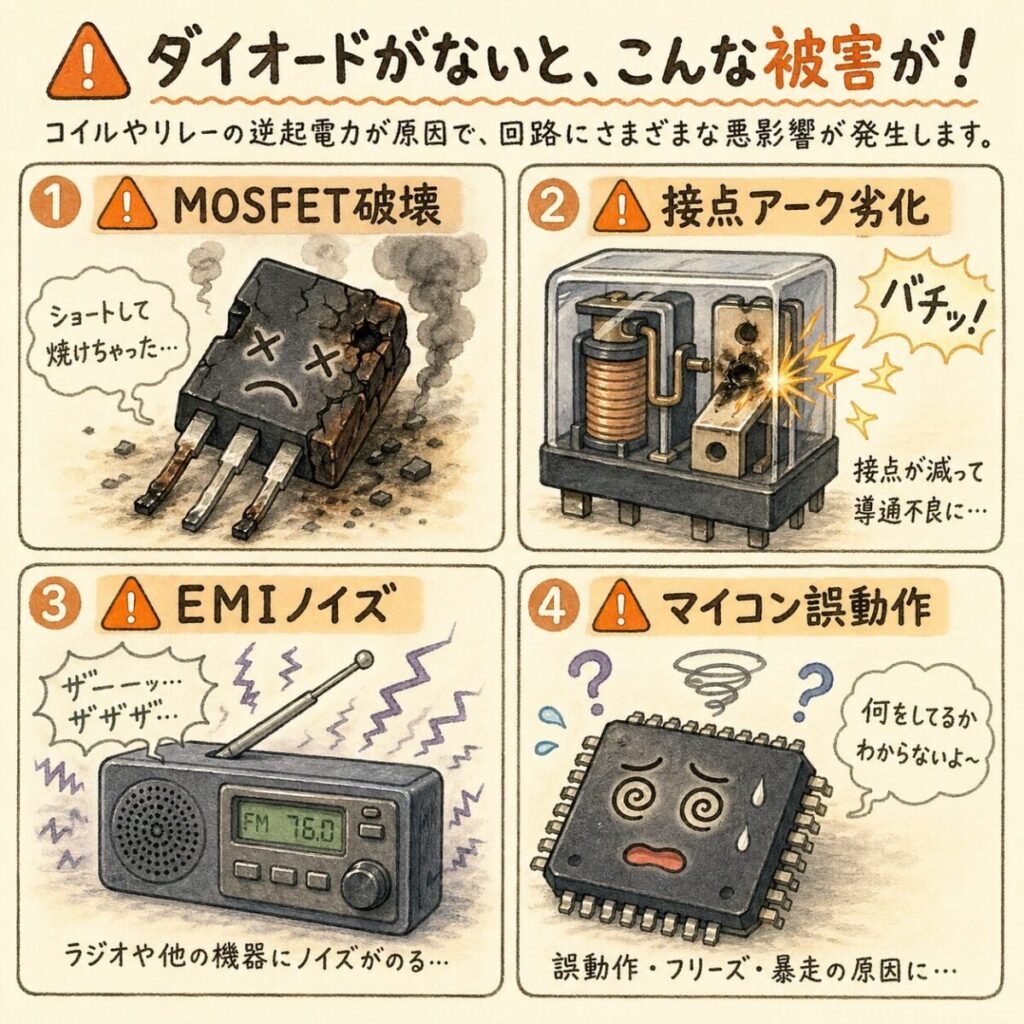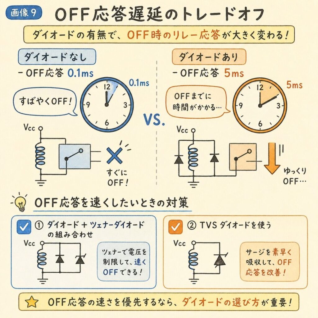 - デメリットはOFF応答の遅延。応答性重視ならツェナー併用やTVSを検討