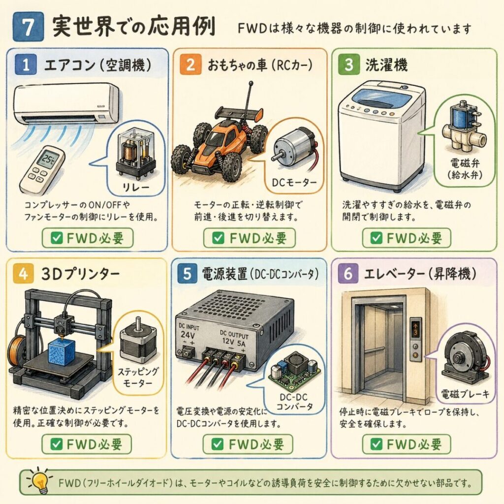 | DCモータ | 玩具、ロボット、ドローン | PWM駆動なら高速ダイオード必要 |