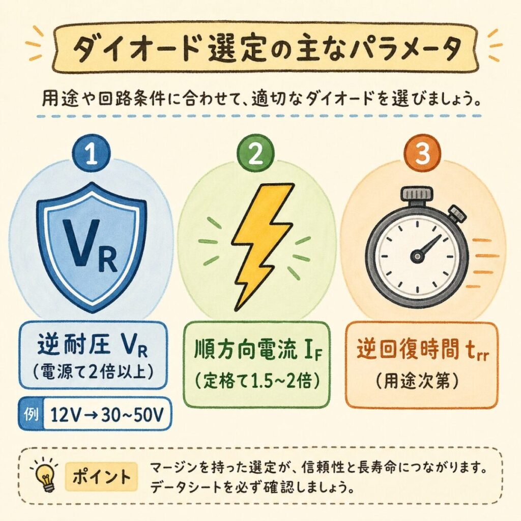 - 選定の3要素:逆耐圧(電源の2倍以上)・順電流(コイル定格以上)・逆回復時間