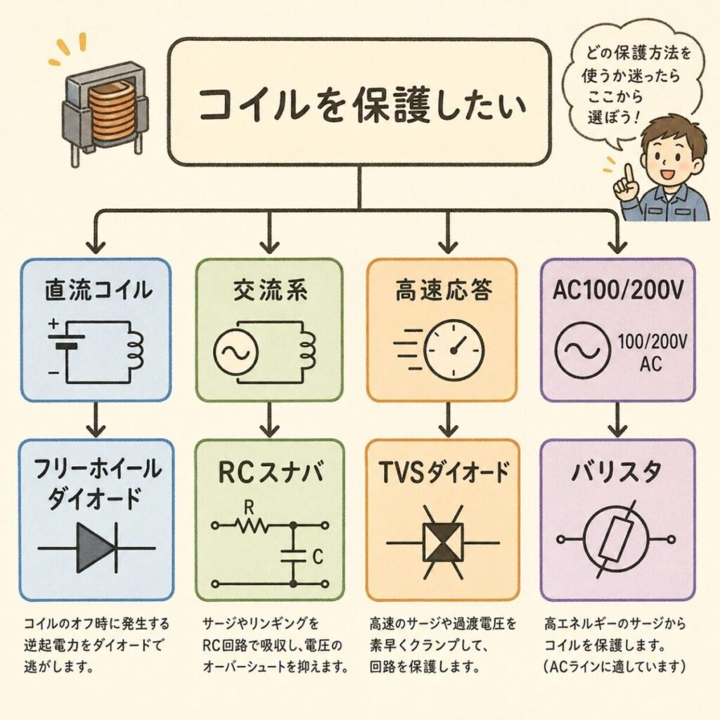 - 直流コイル → ダイオード、交流系 → スナバ、高速応答 → TVS、と使い分け