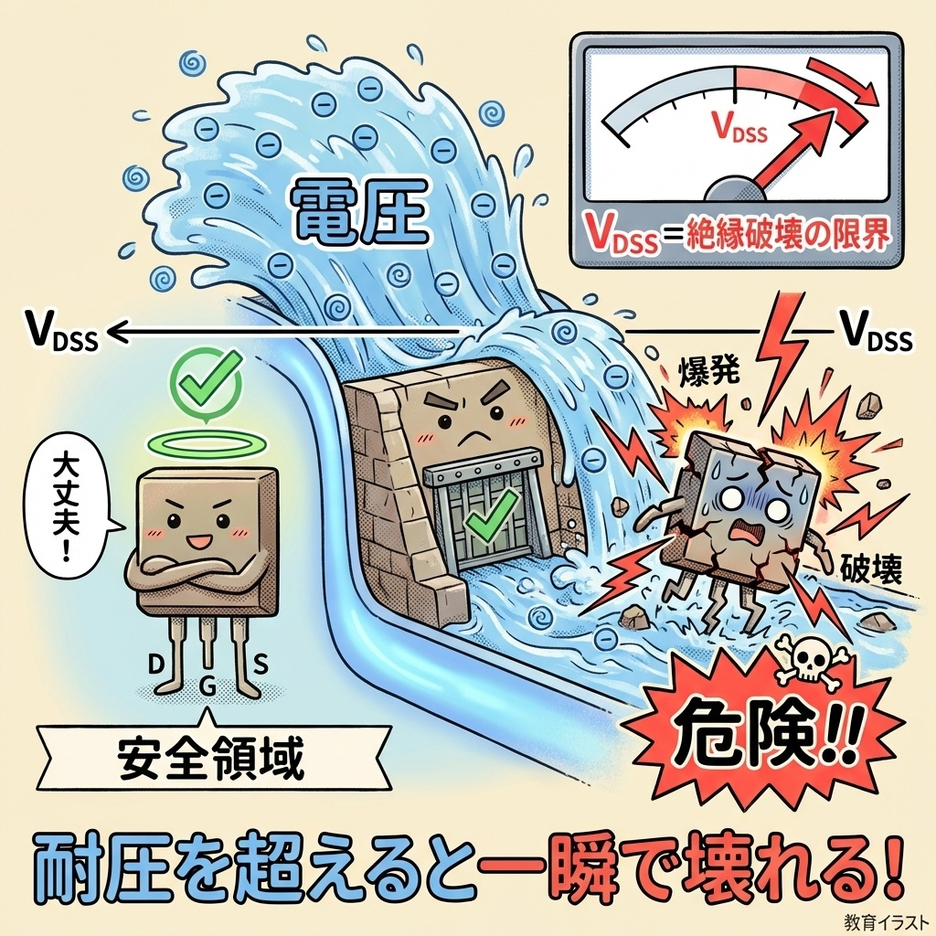 チェック①:耐圧 VDSS|「どれくらいの電圧に耐えられるか」