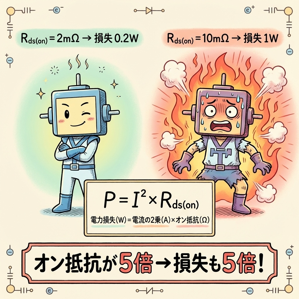 これは効率と発熱を決める最重要パラメータであり、MOSFET選定の核心といえます。