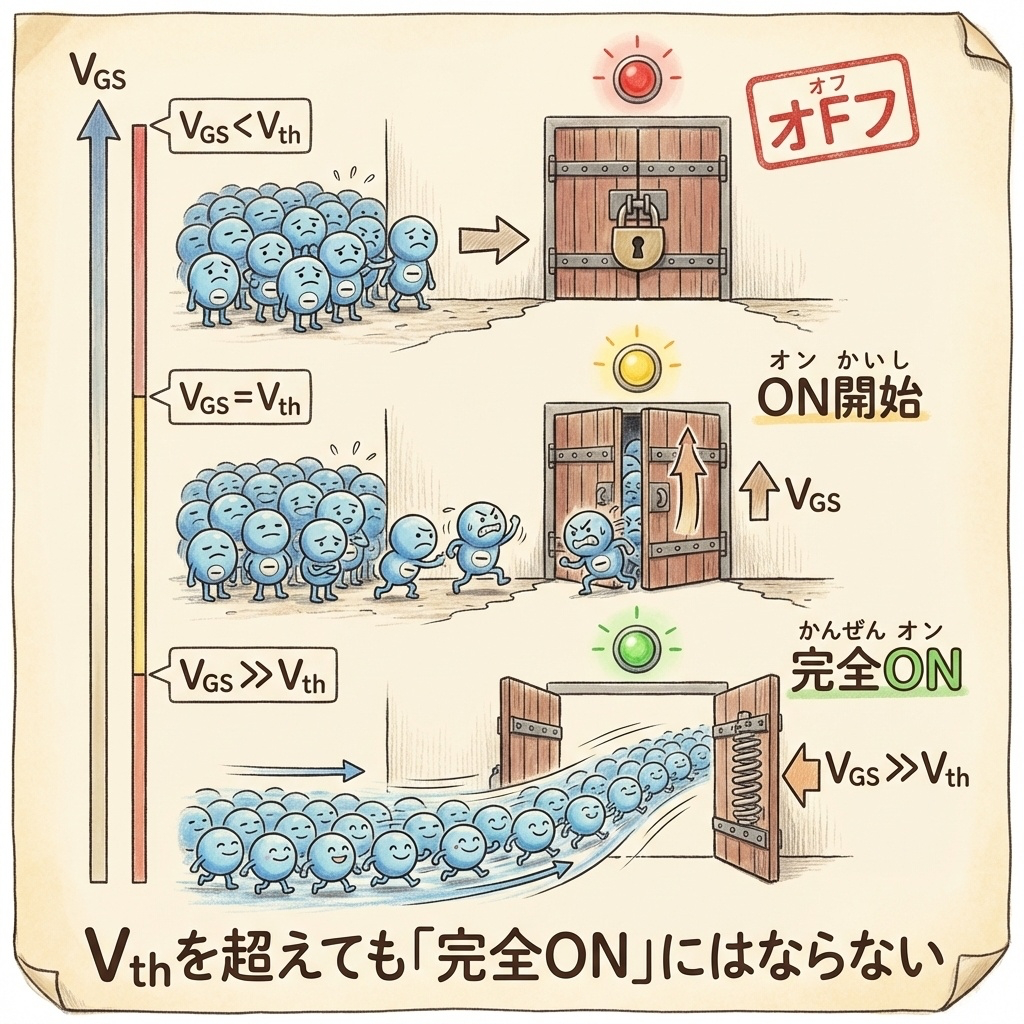 注意すべきは、Vthを超えたら「すぐに完全ON」になるわけではないという点です。完全にON(低いRds(on))になるには、Vthより数V以上高いVGSが必要です。