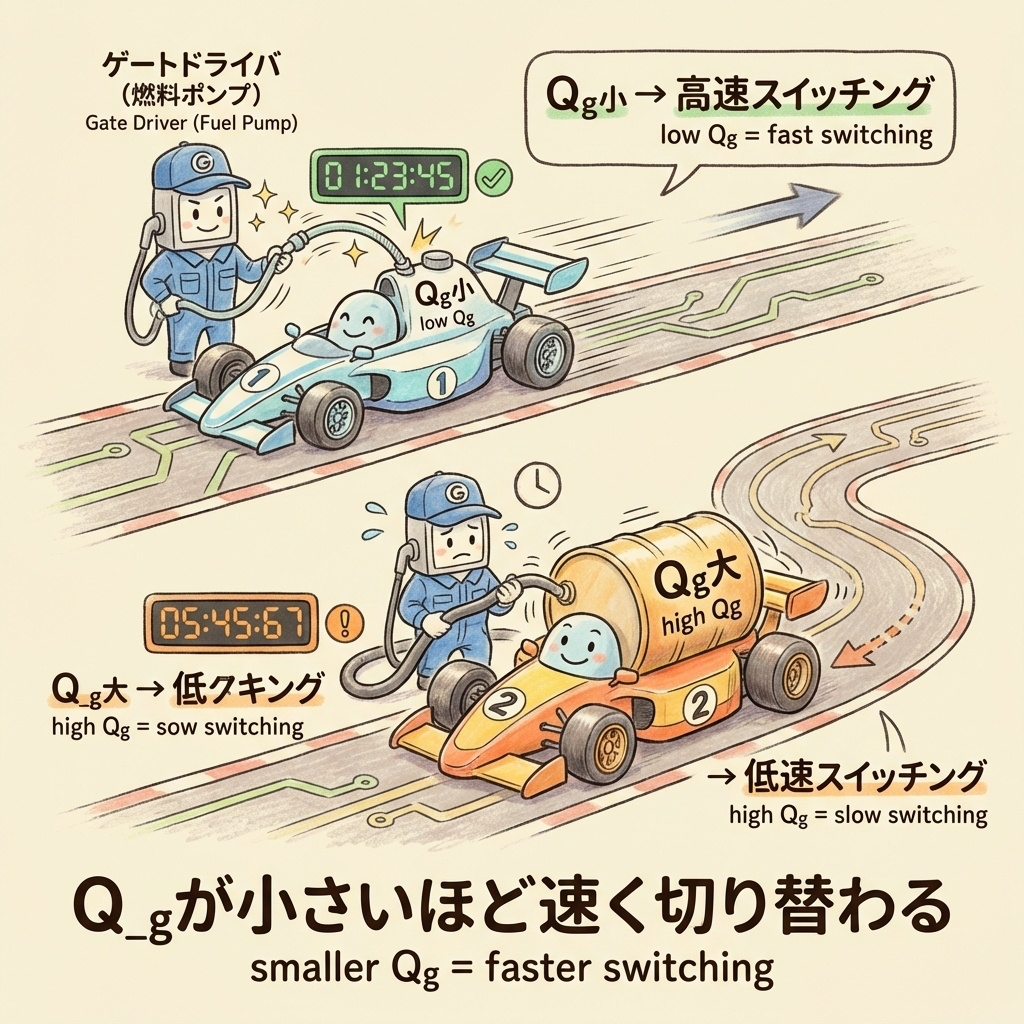 | Qgd | ゲート-ドレイン電荷(ミラー電荷) | スイッチング速度に最も影響 |